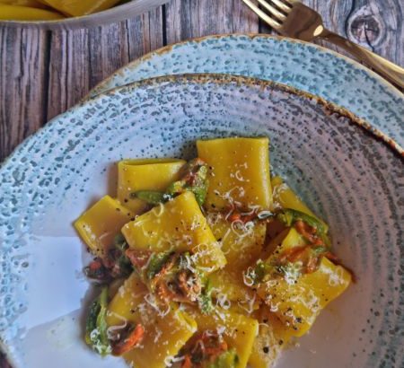 I paccheri con fiori di zucca e zafferano cremosi, sono un piatto che profuma di